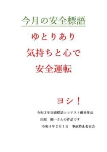 当社、今月の安全標語は『ゆとりあり 気持ちと心で安全運転』です。