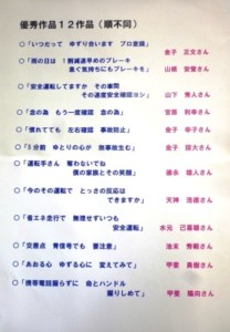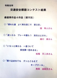 今月の朝礼時には先日から応募してあった交通安全標語コンテストの結果発表が行われ、