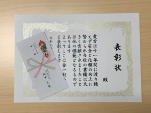 新型コロナウイルスの感染防止のために対象者一人ずつ個別に換気対策を行った環境で行い、表彰状及び金一封を贈呈しました。
